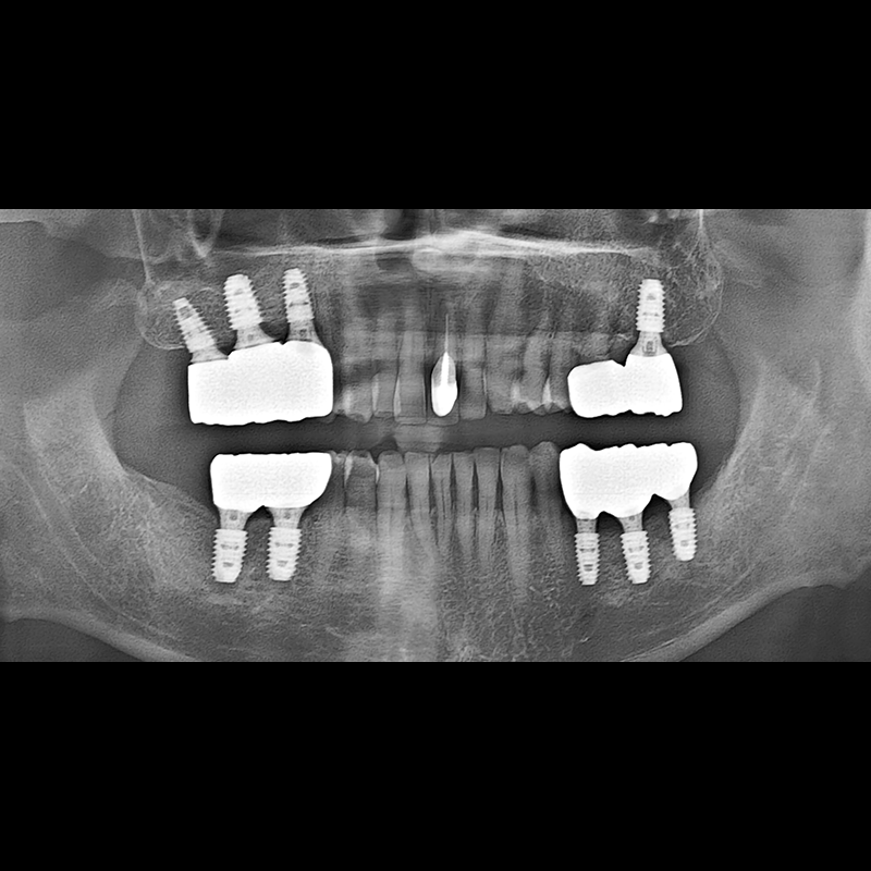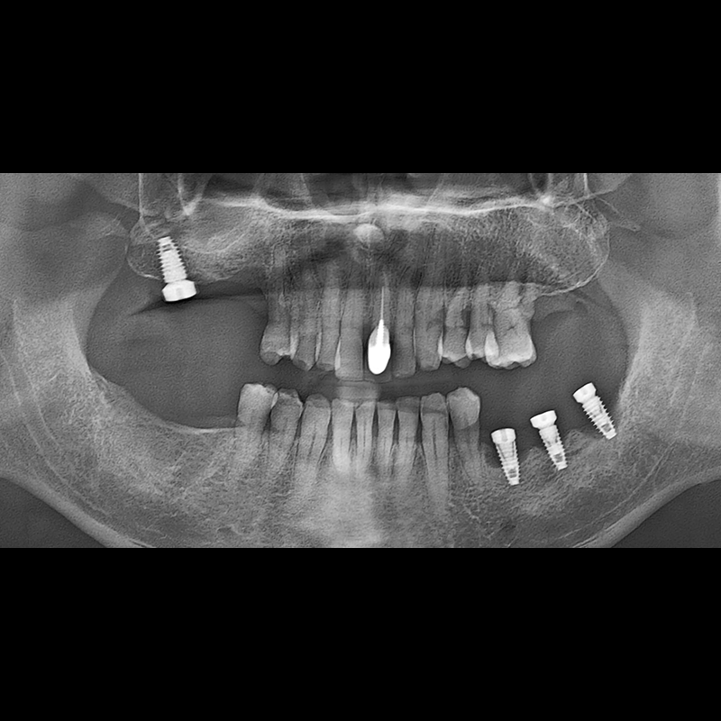 결손된 치아 부분과 살리기 힘든 치아 위치에 임플란트를 식립하였습니다.