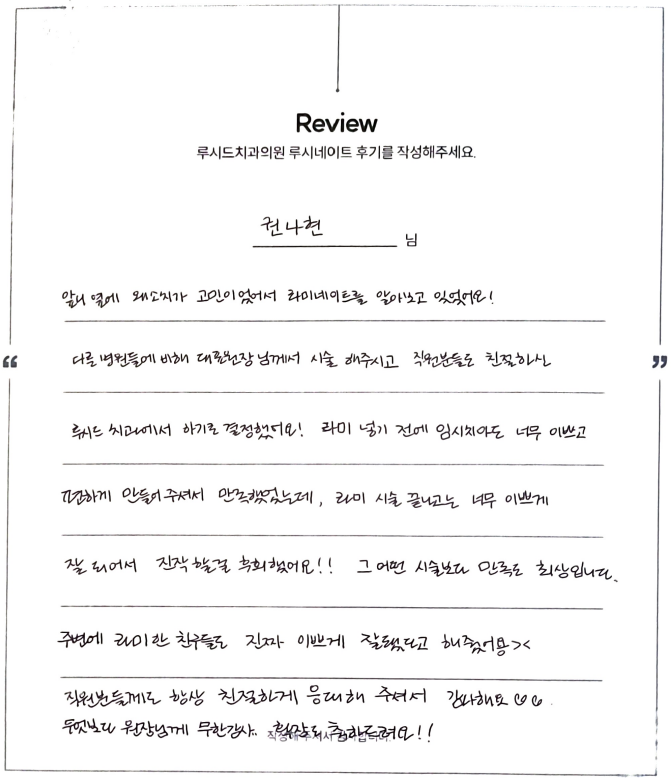 권나현님 루시드치과 루시네이트 자필 후기 입니다.