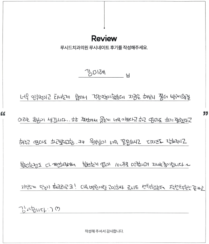 김미례님 루시드치과 루시네이트 자필 후기 입니다.
