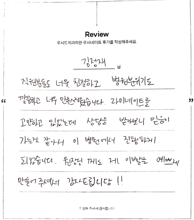 김정재님 루시드치과 루시네이트 자필 후기 입니다.