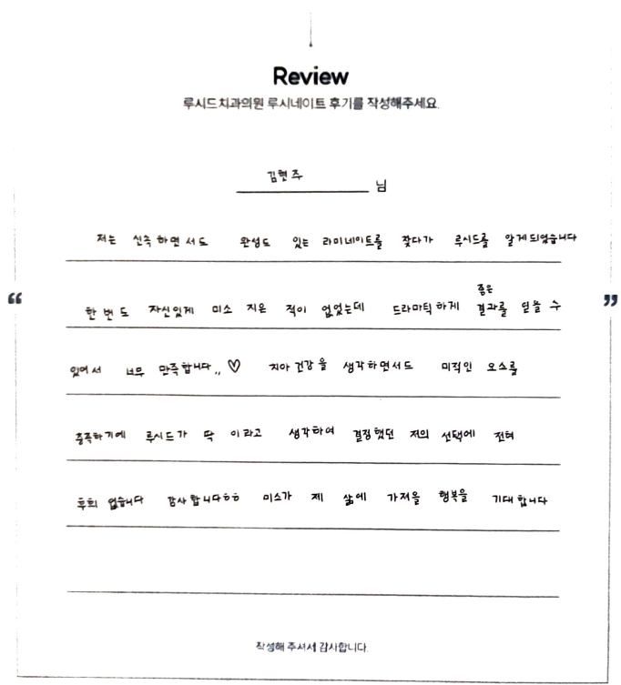 김현주님 루시드치과 루시네이트 자필 후기 입니다.