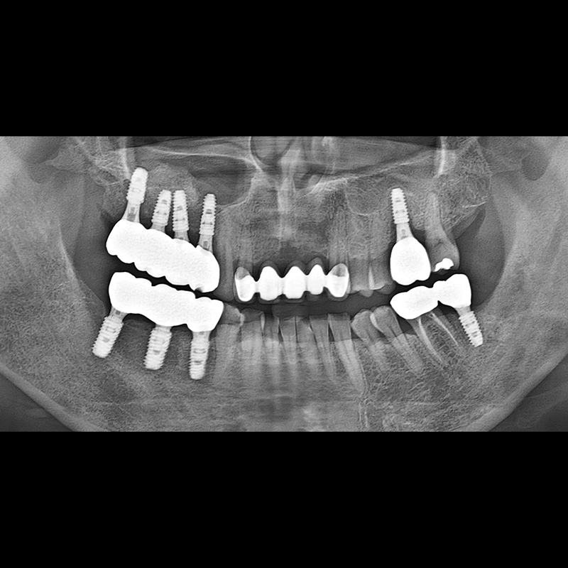 在缺失的牙齿部分和难以挽救的牙齿位置植入了种植牙。