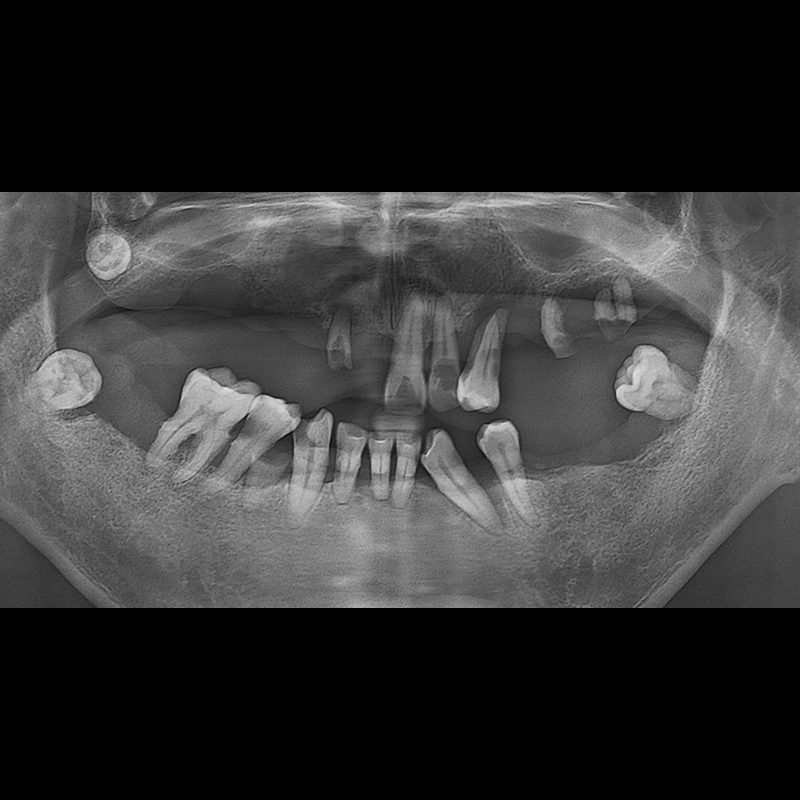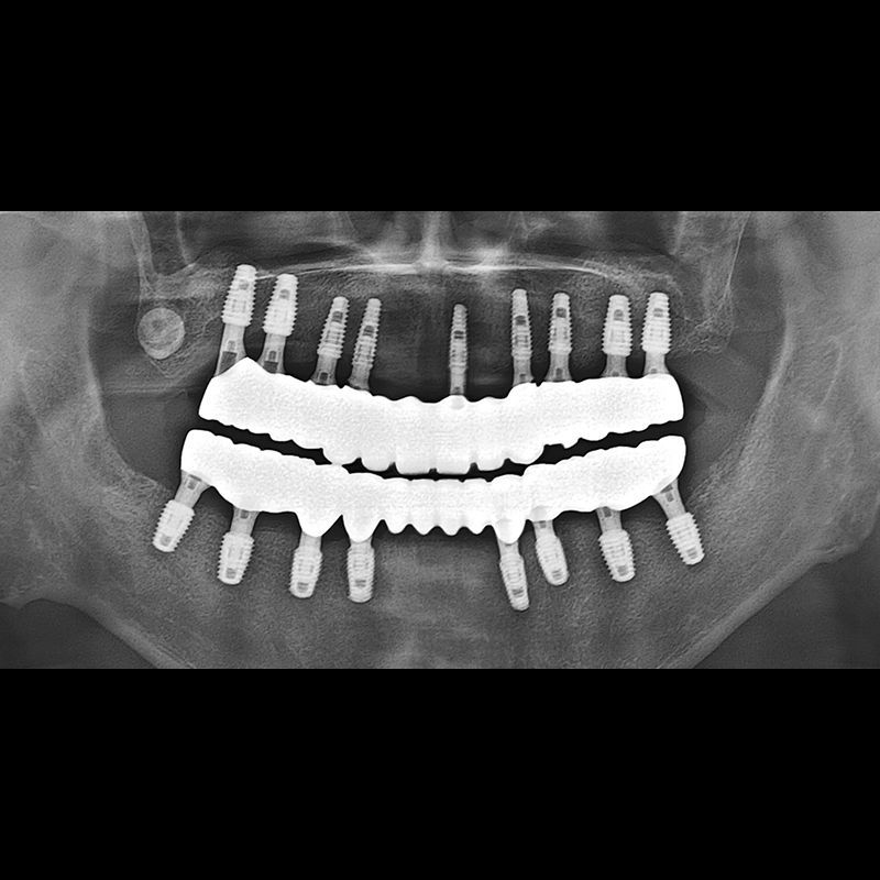 在缺失的牙齿部分和难以挽救的牙齿位置植入了种植牙。