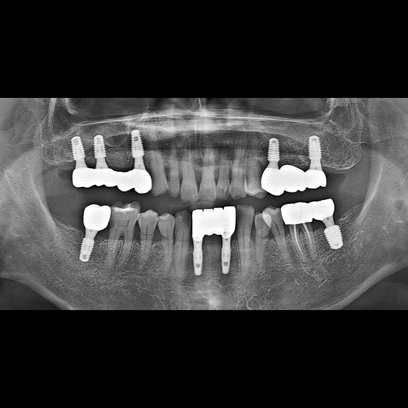 在缺失的牙齿部分和难以挽救的牙齿位置植入了种植牙。
