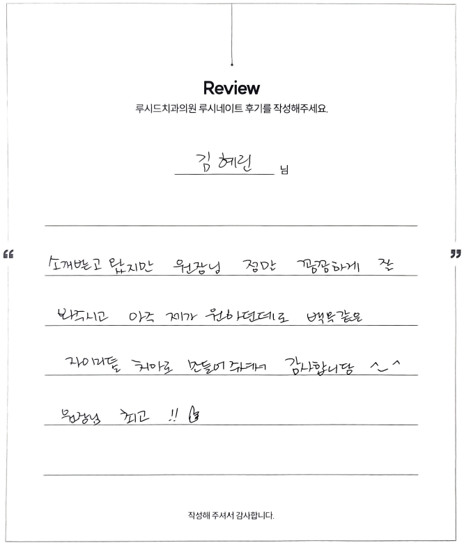 김혜린님 루시드치과 루시네이트 자필 후기 입니다.
