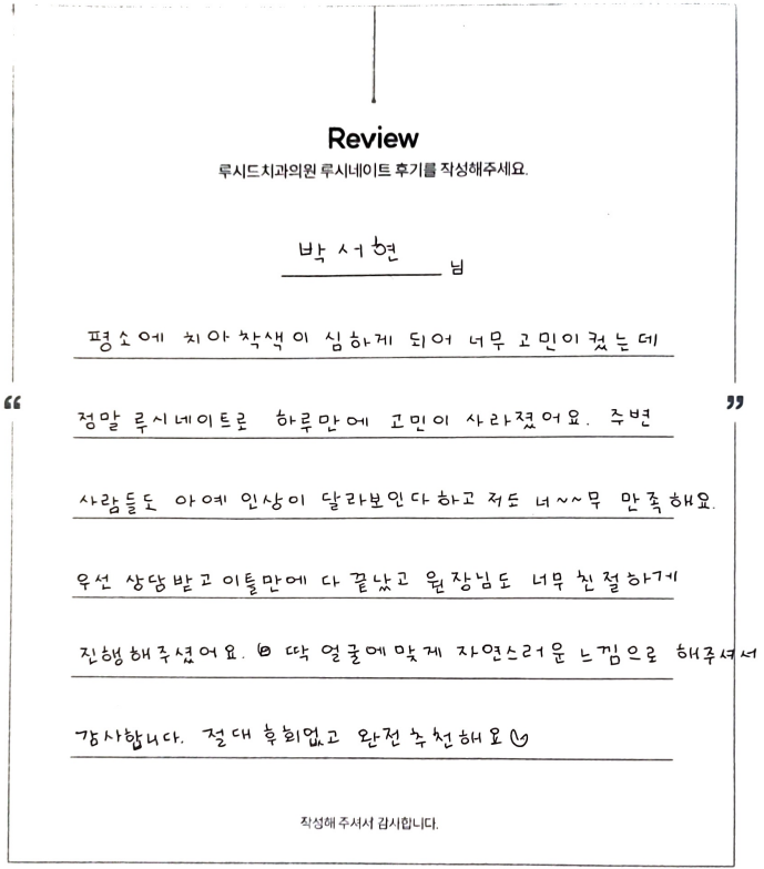 박서현님 루시드치과 루시네이트 자필 후기 입니다.