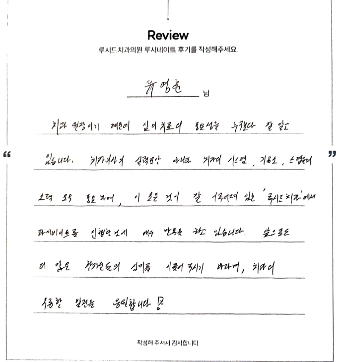 유영훈님 루시드치과 루시네이트 자필 후기 입니다.