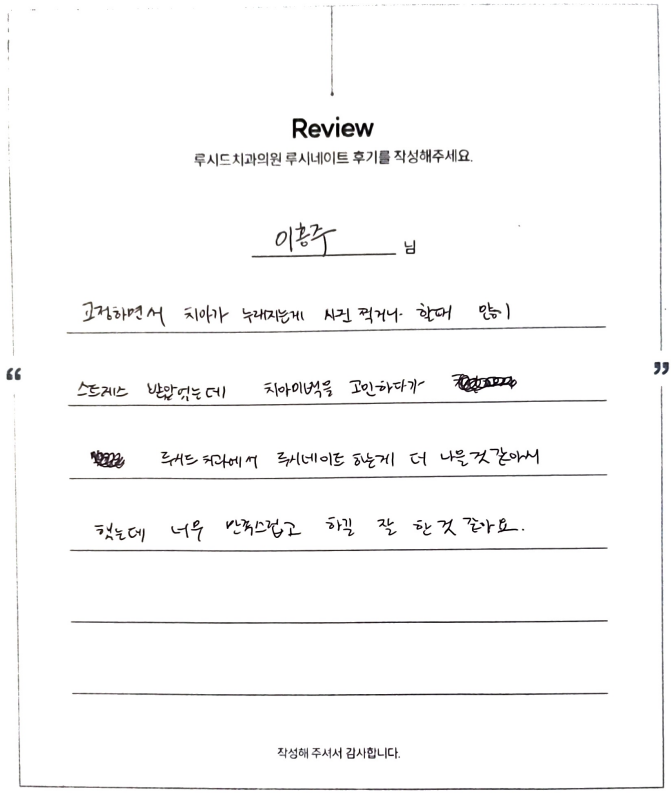 이홍주님 루시드치과 루시네이트 자필 후기 입니다.