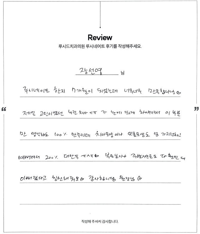 장선영님 루시드치과 루시네이트 자필 후기 입니다.