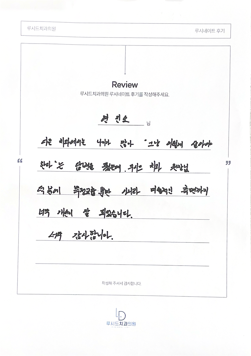 연진오님 루시드치과 루시네이트 자필 후기 입니다.