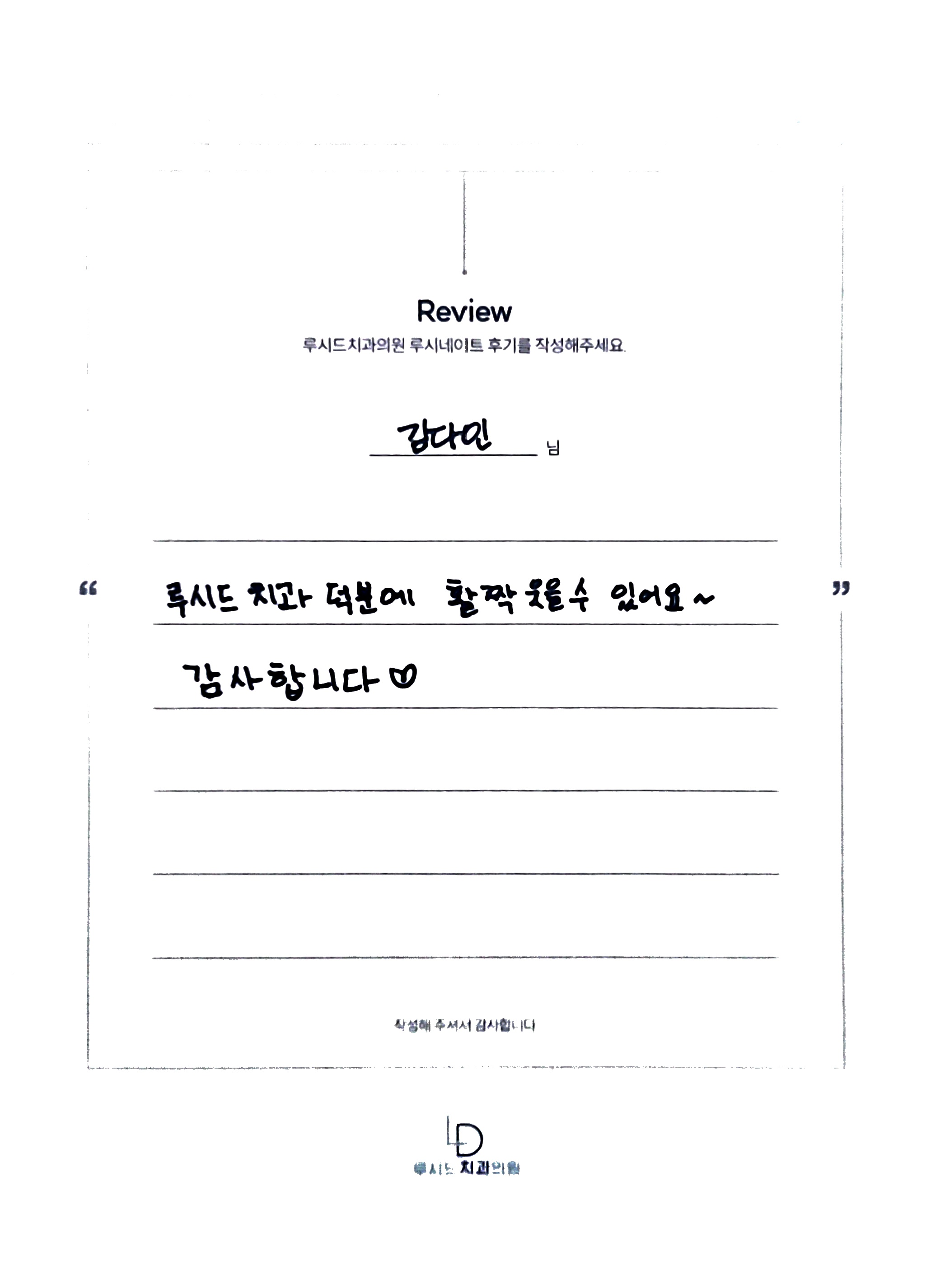 김다인님 루시드치과 루시네이트 자필 후기 입니다.