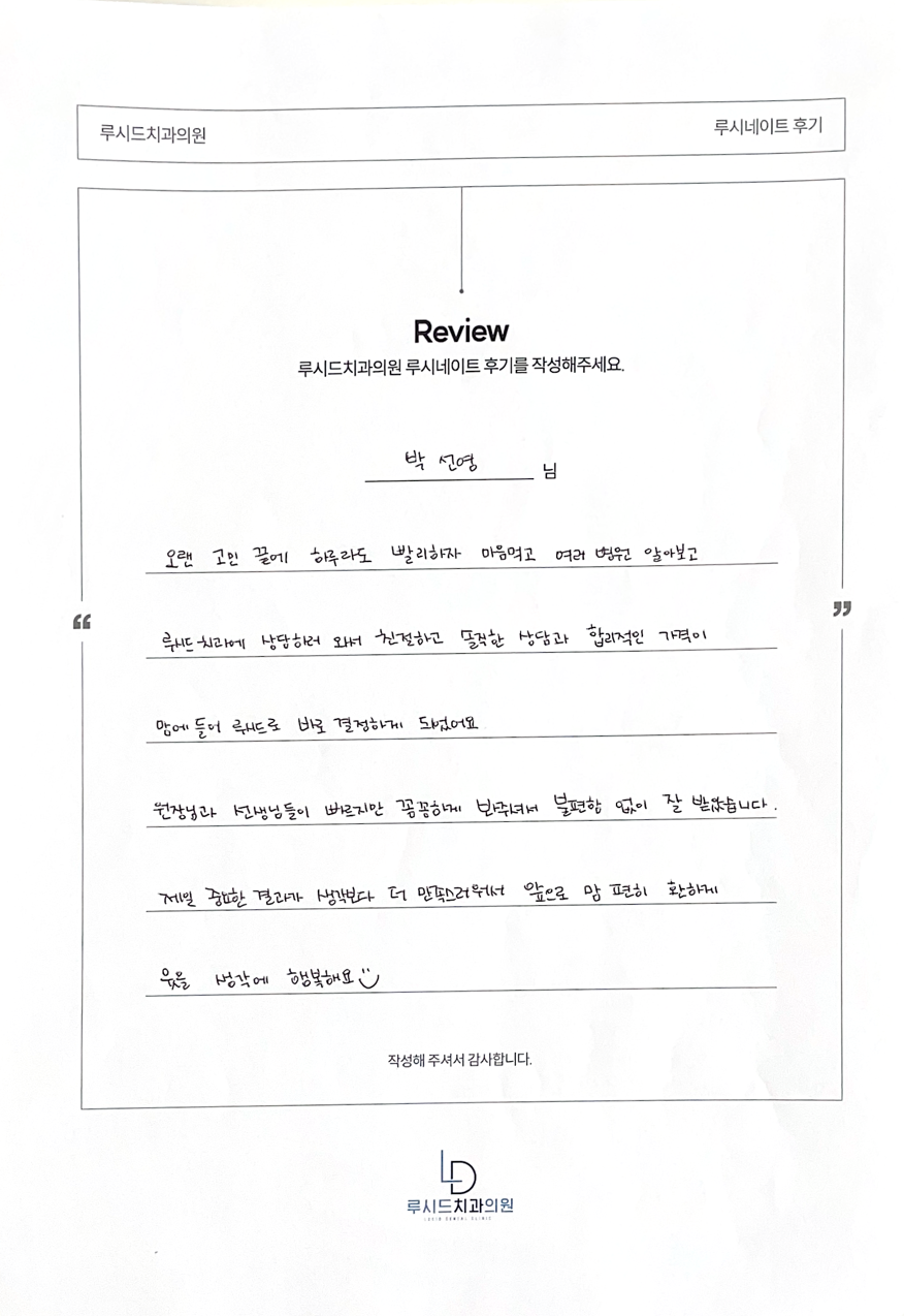 박선영님 루시드치과 루시네이트 자필 후기 입니다.