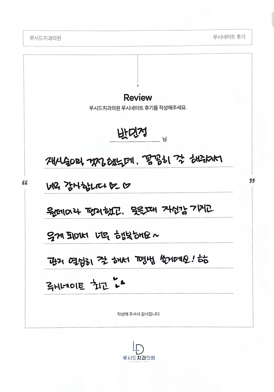 박민정님 루시드치과 루시네이트 자필 후기 입니다.