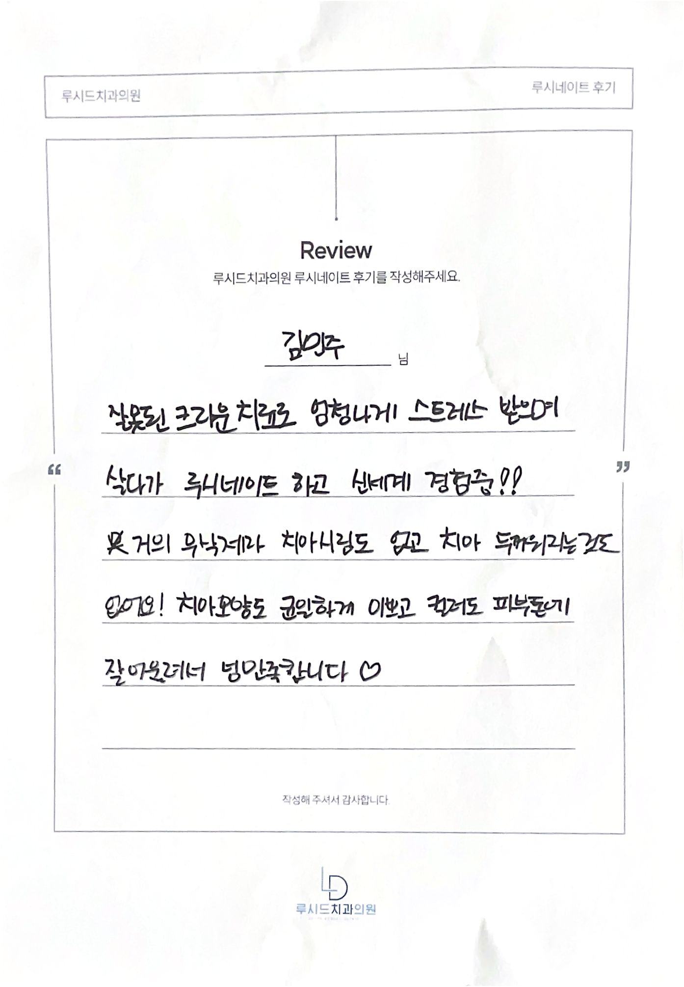 김민주님 루시드치과 루시네이트 자필 후기 입니다.