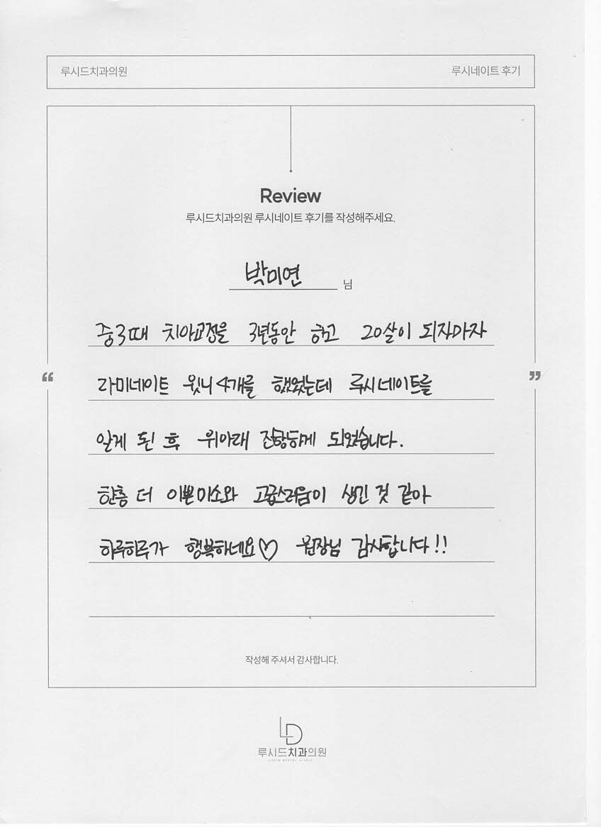 박미연님 루시드치과 루시네이트 자필 후기 입니다.
