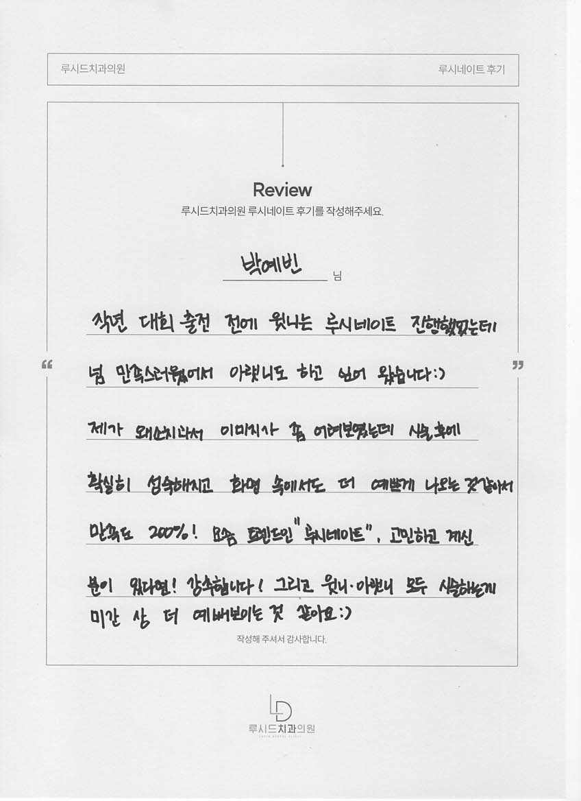 박예빈님 루시드치과 루시네이트 자필 후기 입니다.