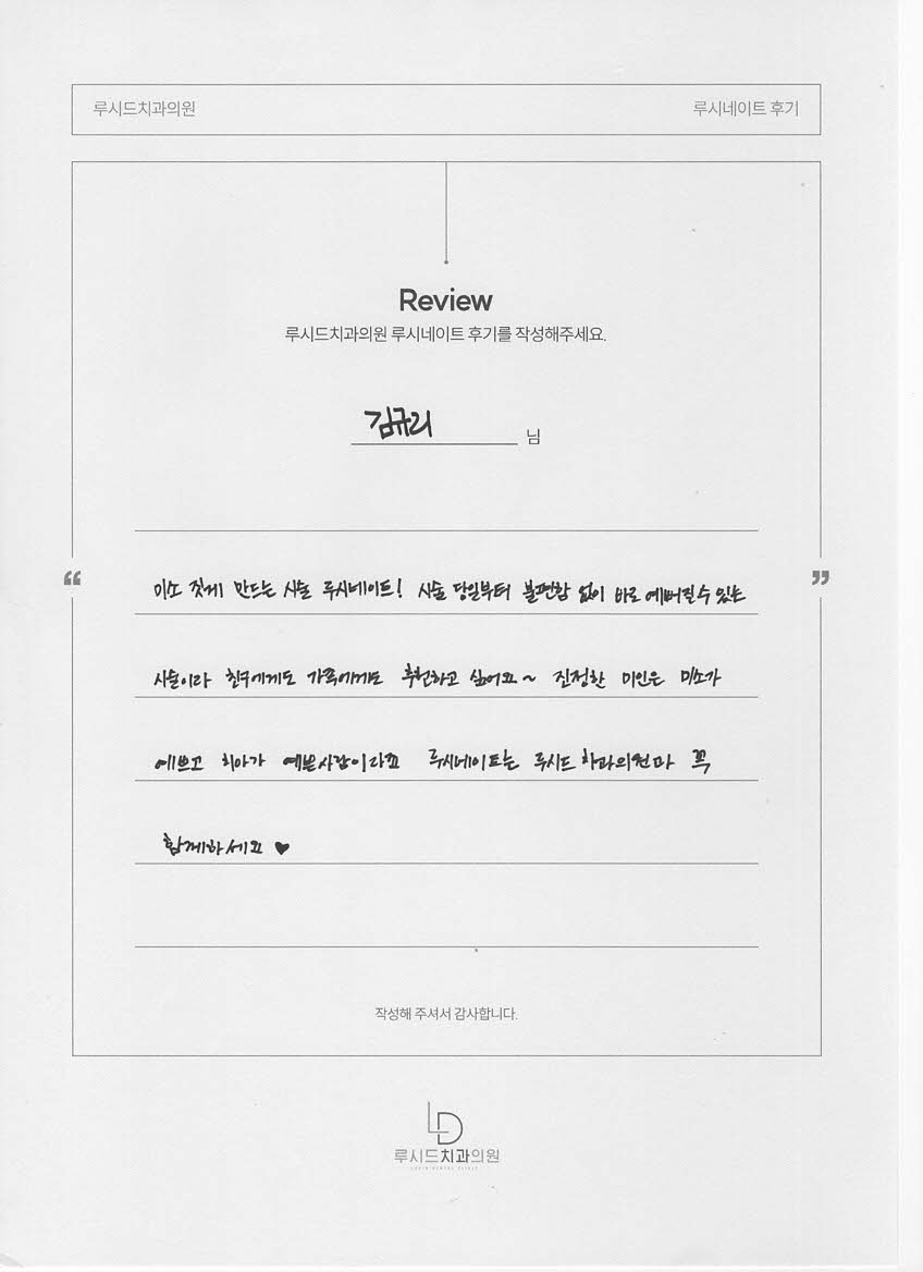 김규리님 루시드치과 루시네이트 자필 후기 입니다.