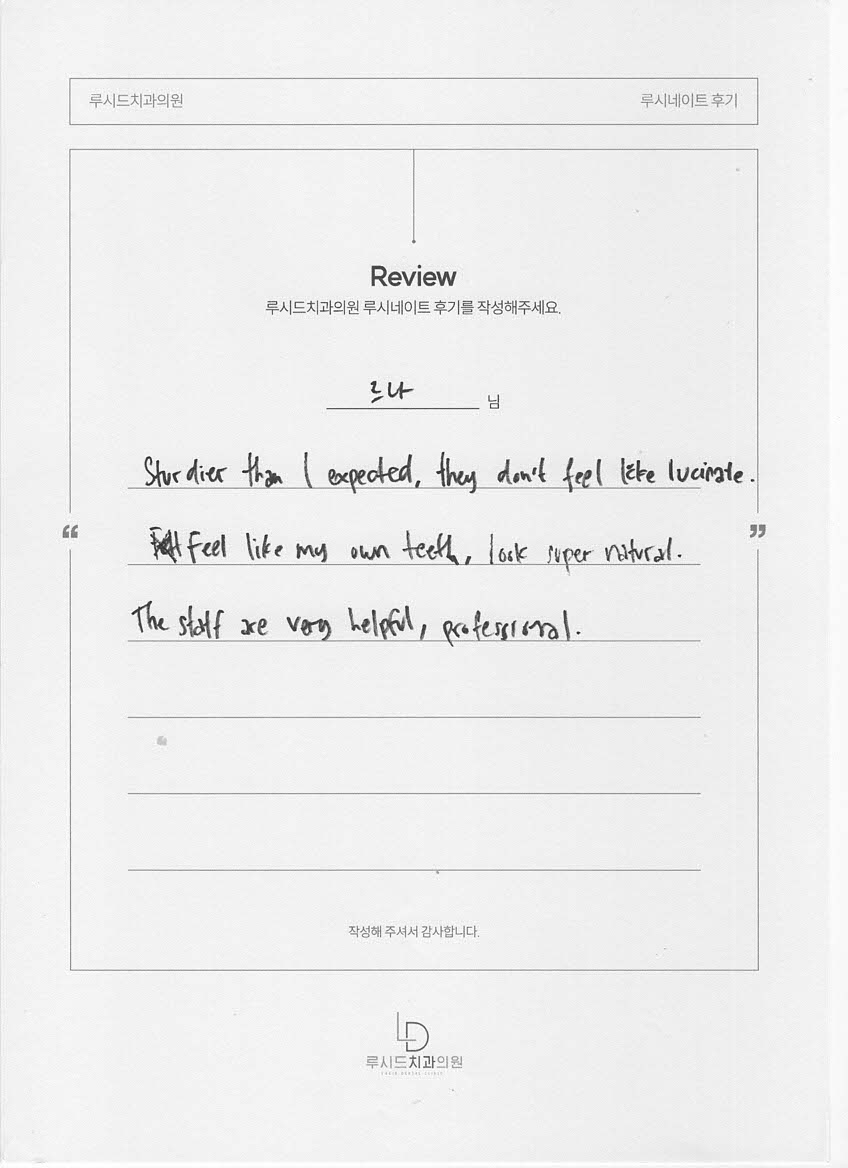 르나님 루시드치과 루시네이트 자필 후기 입니다.