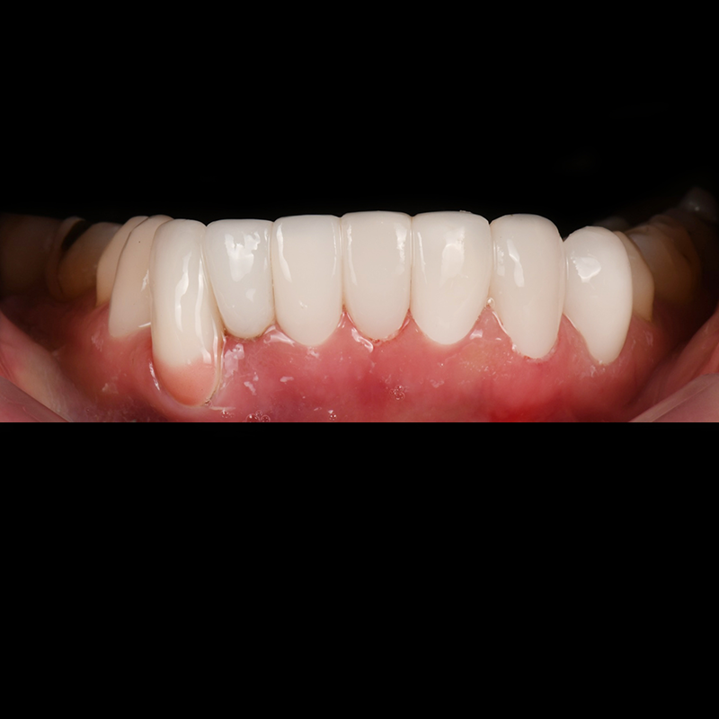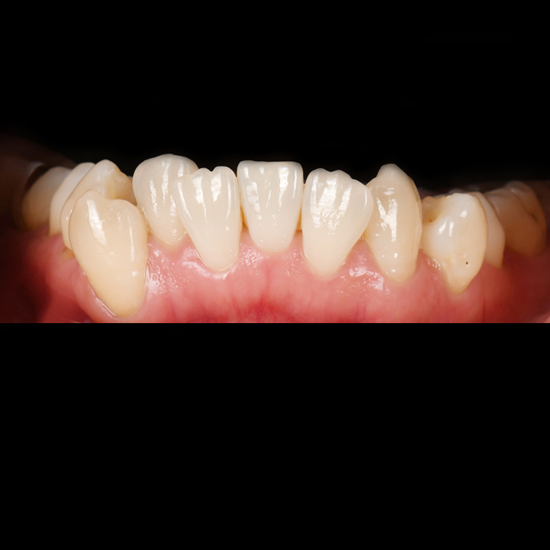 変色した歯と不正咬合矯正のため、最小削除/無削除ルシネートを付着して改善しました。